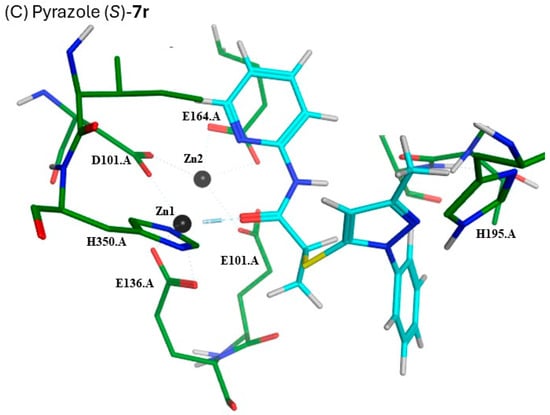 Docking of (A) most achiral pyrazole 7d, (B) (R)-pyrazole 7q, and (C) (S)-pyrazole 7r to the active site of NmDapE, PDB 5UEJ.