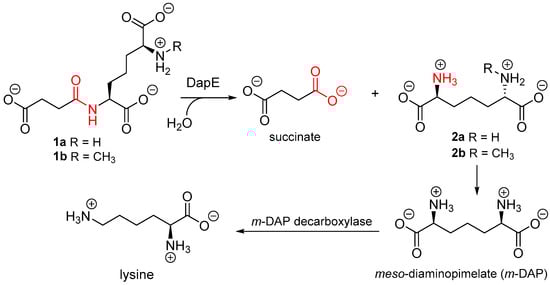 - Usha, V.; Lloyd, A.J.; Roper, D.I.; Dowson, C.G.; Kozlov, G.; Gehring, K.; Chauhan, S.; Imam, H.T.; Blindauer, C.A.; Besra, G.S. Reconstruction of Diaminopimelic Acid Biosynthesis Allows Characterisation of Mycobacterium Tuberculosis N-Succinyl-L,L-Diaminopimelic Acid Desuccinylase. Sci. Rep. 2016, 6, 23191. [Google Scholar] [CrossRef]