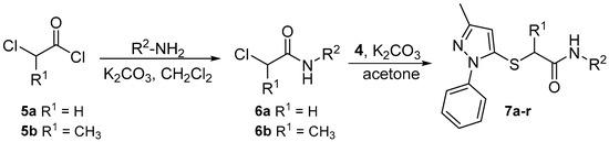 All solvents were distilled prior to use or purchased as anhydrous grade. All reagents were used without further purification unless otherwise noted. Molecular sieves were activated at 300–350 °C under vacuum unless otherwise stated. Chloroacetyl chloride, 2-chloropropionyl chloride, amino heterocycles, amines, and potassium carbonate were purchased from Sigma-Aldrich (St. Louis, MO, USA). Synthesis of 3-methyl-1-phenyl-1H-pyrazole-5-thiol was conducted according to the literature. All synthetic reactions were conducted under an atmosphere of nitrogen. Silica gel 60 Å, 40–75 µm (200 × 400 mesh) was used for column chromatography. Aluminum-backed silica gel 200 µm plates purchased from Sorbtech (Norcross, GA, USA) were used for TLC. 1H NMR and 13C NMR spectra were obtained using a Bruker 500 MHz spectrometer (Bruker Corporation, Madison, WI, USA) with tetramethylsilane (TMS) as the internal standard. The 1H NMR spectra were collected using the 500 MHz frequency and the 13C NMR spectra were obtained using the 125 MHz frequency of the same Bruker 500 MHz spectrometer. NMR spectra were processed using Mnova NMR software (version 4.14.1) produced by Mestrelab Research (Santiago de Compostela, Spain). The purity of all compounds was determined to be ≥95% by high-performance liquid chromatography (HPLC). HRMS spectra were measured on a TOF instrument by electrospray ionization (ESI). HRMS spectra were collected using a Waters Acquity I class UPLC and Xevo G2-XS QT of mass spectrometer (Waters Xevo, Wexford, Ireland) with Waters Acquity BEH C18 column (1.7 µm, 2.1 × 50 mm; Waters Xevo, Wexford, Ireland).