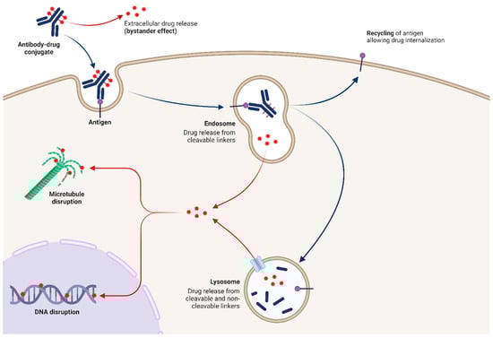 The ADCs’ antibody binding to the antigen expressed in tumor cells leads to payload internalization in the endosome and the subsequent release of CT within the tumor cells. Afterwards, the antigen is freed from the antibody, recycled, and re-expressed in the cell membrane, allowing for new internalization [11] (Figure 1 and Figure 2).