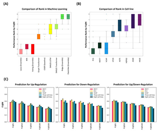 Comparative Analysis of Gene Expression Ranking Prediction Models. (A) A boxplot illustrates the comparative rankings of different machine learning models based on the F1@K metrics in the cross-validation dataset. (B) A boxplot shows the ranking comparison across various cell lines using the F1@K metrics in the cross-validation dataset. (C) Bar plots present the performance of gene expression ranking prediction models trained on different cell line datasets, including MCF7, PC3, VCAP, a combination of three cell lines, and all eight cell lines. The models are evaluated using the F1@K metrics in the cross-validation dataset for predicting up-regulated, down-regulated, and up/down-regulated genes.