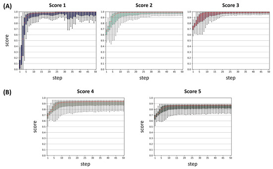 SAGE-based Target Specificity Optimization and Virtual Screening Results for PARP1. (A,B) Boxplots represent each step in the de novo design of PARP1 inhibitors through the SAGE process: (A) Scores 1, 2, and 3; (B) Scores 4 and 5. The median of each boxplot is highlighted in red.