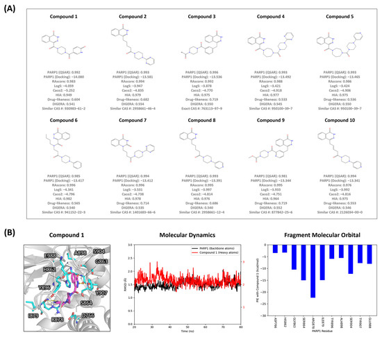 Visualization and Interaction Analysis of Top-ranked Compounds for PARP1. (A) The top 10 compounds identified by the SAGE process are illustrated, along with their predicted values. (B) The binding mode of compound 1 is illustrated, highlighting key residues of PARP1 identified through quantum-mechanical FMO analysis. The molecular dynamics simulation trajectories of the compound with PARP1 are shown, with the backbone atoms of PARP1 depicted in black and the heavy atoms of the ligand in red. Quantum-mechanical FMO analysis of the complex is presented, focusing on significant interactions that are more stable than −3.0 kcal/mol.