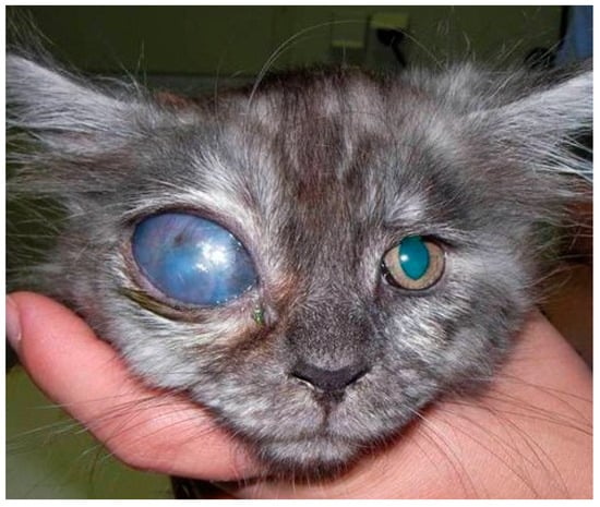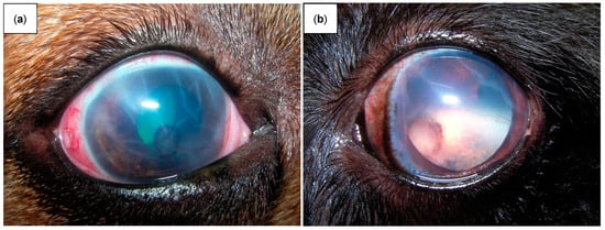 Congenital glaucoma is present at birth (Figure 1), being diagnosed in newborn animals through a complete and comprehensive ophthalmological exam, including gonioscopy on all littermates [10,29,30]. Typically, affected animals display abnormalities in the iridocorneal angle and pectinate ligament dysplasia. In these cases, treatment typically involves laser ciliary body ablation or enucleation, while evisceration and silicone prosthesis implantation can be an option when buphthalmos is mild and the fibrous tunica is preserved [8,10,30]. If the eyes are enucleated, the globes should be examined histologically to confirm the glaucoma’s cause.