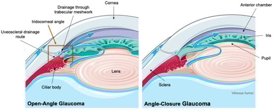 Concerning overall glaucoma pathophysiology, IOP increases due to inadequate drainage of the aqueous humor, which corresponds to the fluid in the anterior and posterior chambers produced by the ciliary body, located behind the iris. This fluid passes through the pupil and exits from the anterior chamber via the iridocorneal angle, which is positioned at the intersection between the cornea and the iris and includes the trabecular meshwork and Schlemm’s canal, this corresponding to the conventional outflow pathway. The unconventional route, or uveoscleral outflow, is estimated to carry 3–82% of total aqueous humor drainage across various species [18].
