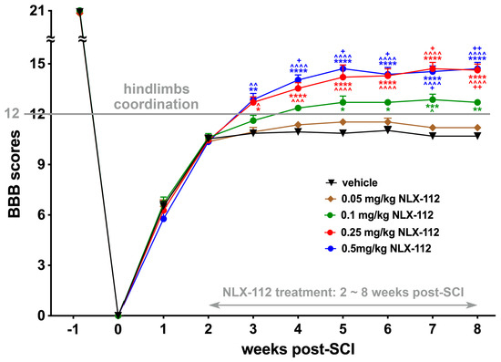 Locomotor recovery after contusive SCI was assessed using the BBB open-field test. NLX-112 (5-HT1A receptor agonist) treatments were started at 2 weeks post-SCI and lasted for an additional 6 weeks. Statistical analyses of BBB scores (mean ± SEM) showed that NLX-112 treatments significantly increased BBB scores over the observation period in a dose-dependent fashion. * p < 0.05, ** p < 0.01, *** p < 0.001, and **** p < 0.0001 vs. SCI + vehicle animals; ^ p < 0.05, ^^ p < 0.01, ^^^ p < 0.001, and ^^^^ p < 0.0001 vs. SCI + 0.05 mg/kg NLX-112 animals; + p < 0.05, and ++ p < 0.01 vs. SCI + 0.1 mg/kg NLX-112 animals (two-way ANOVA with a Tukey’s post hoc test). N = 6 per group.