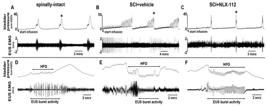 The LUT function of SCI animals treated with NLX-112 was analyzed by CMG and EUS EMG recordings. Three representative consecutive voiding cycles with CMG and EUS EMG recordings are shown from the (A) spinally-intact, (B) SCI + vehicle, and (C) SCI + NLX-112 groups. Note that the SCI + vehicle group needed less time to reach the second voiding contraction after the first voiding contraction, which had low voiding efficiency. Highlights of the representative HFO and EUS EMG activity during the micturition point (asterisks in A–C) are shown in (D–F). Note that there were relatively clear and consistent bursting activities in NLX-112-treated animals compared to SCI + vehicle-treated animals.