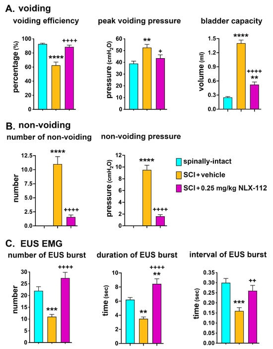Effects of long-term systemic delivery of NLX-112 on micturition reflexes in T8 contused animals. Statistical analyses of parameters (mean ± SEM) representing voiding (A), non-voiding (B), and EUS EMG (C) activity recorded in the spinally-intact, SCI + vehicle, and SCI + NLX-112 groups. ** p < 0.01, *** p < 0.001, and **** p < 0.0001 vs. the spinally intact group; + p < 0.05, ++ p < 0.01, and ++++ p < 0.0001 vs. the SCI + vehicle group (one-way ANOVA with a Tukey’s post hoc test). N = 6 or 8 per group.