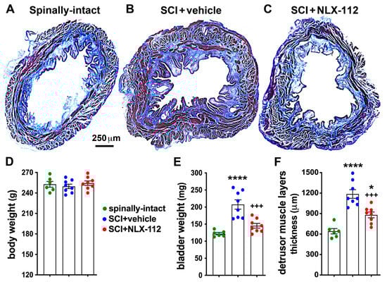 NLX-112 treatment significantly improved bladder morphology after SCI. Representative transverse bladder sections stained with Masson’s trichrome are shown for spinally-intact (A), SCI + vehicle (B), and SCI + NLX-112 (C) animals. The red color indicates muscle fibers and the blue color indicates collagen. Statistical analyses of animal body weight (D), bladder weight (E), and the thickness of detrusor muscle layers (F) are shown as mean ± SEM for the three animal groups. * p < 0.05, and **** p < 0.0001 vs. spinally-intact group; +++ p < 0.001 vs. SCI + vehicle group (one-way ANOVA with a Tukey’s post hoc test). N = 6 or 8 per group.