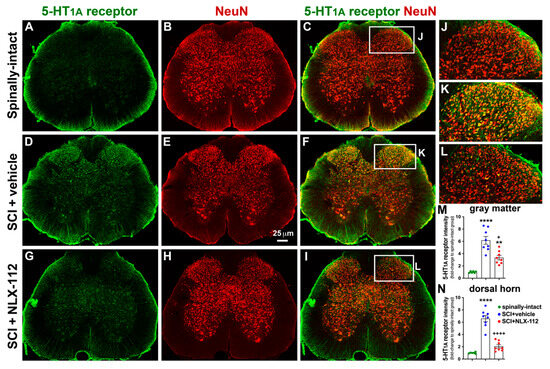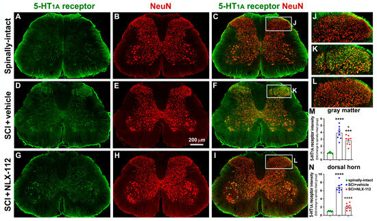 NLX-112 treatment significantly reduced 5-HT1A receptors in the L6/S1 spinal cord segments after SCI. Representative transverse sections with double immunostaining of 5-HT1A receptor (green) and NeuN (red) are shown from spinally-intact (A–C), SCI + vehicle l (D–F), and SCI + NLX-112 (G–I) animals. The higher magnification images (J–L) were taken from the dorsal horn region of the images in (C), (F), and (I), respectively. Statistical analyses of the intensity of 5-HT1A receptors (mean ± SEM) in the gray matter (M) and dorsal horn (N) are shown among the groups. ** p < 0.01 and **** p < 0.0001 vs. spinally-intact group; + p < 0.05 and ++++ p < 0.0001 vs. SCI + vehicle group (one-way ANOVA with a Tukey’s post hoc test). N = 6 or 8 per group.