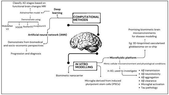 Computational models, such as the AlzheimerNet model proposed by Shamrat et al. [149], leverage deep learning to classify AD stages based on functional brain alterations in magnetic resonance imaging. This model demonstrates the possibility of artificial intelligence in AD diagnosis and staging by evaluating the performance of models such as VGG16, InceptionV3, AlexNet, MobileNetV2, and ResNet50, with InceptionV3 achieving the most remarkable test accuracy of 96.31% [150,151,152]. Furthermore, data-driven models, such as those developed by Bayraktar et al. [153], utilise molecular communication and artificial neural network models to analyse AD from biomedical and socio-economic perspectives. These models offer innovative approaches to understanding AD progression and diagnosis. Additionally, Gnanadesigan et al. [154] introduced a novel approach that uses intelligent-based deep learning models and network topology measurement to find potential genes for AD. Their study demonstrated the effectiveness of the suggested network topology model for an artificial neural network (ANN) classifier compared to existing models [154].