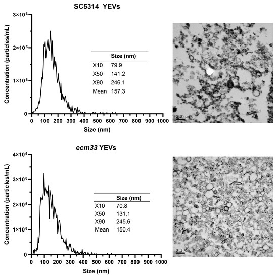 YEVs secreted by the ecm33Δ cell wall mutant (ecm33 YEVs) were isolated and morphologically characterized. These vesicles were compared with YEVs derived from the SC5314 parental wild-type strain (SC5314 YEVs). Both were cultured under identical conditions (16 h of growth in YPD at 37 °C and 180 rpm). Electron microscope images revealed typical spherical structures with a denser bilayer. Nanoparticle tracking analysis (NTA) revealed consistent vesicle sizes of 100–200 nm for both strains (Figure 1) and a concentration of 3.02 × 1015 EVs/L for SC5314 and 2.7 × 1015 EVs/L for the mutant strain under identical culture conditions.
