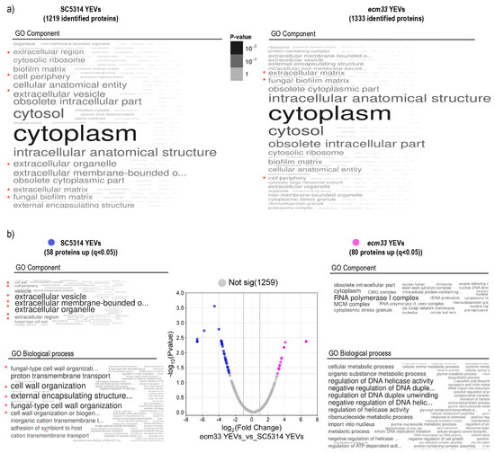 To compare the differences in the protein cargo of the EVs secreted by the wild-type and the mutant strains, we carried out a proteomic study. Three biological replicates of each type of EV were analyzed. We identified a total of 1443 proteins: 1219 (Table S1) and 1333 (Table S2) corresponding to SC5314 YEVs and ecm33 YEVs, respectively, including 1109 proteins in common. The Gene Ontology (GO) enrichment analysis of the different protein sets revealed a higher enrichment of cell wall and cell surface proteins in the SC5314 YEVs compared to ecm33 YEVs (Figure 2a).