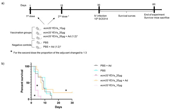 We studied the optimal conditions to test the effect of the immunization with ecm33 YEVs. High doses of 10 or 20 µg were used as the first approach (Figure 3). Mice were immunized by subcutaneous injection in two doses with a 2-week interval (Figure 3a). To determine the effect of including an adjuvant in the immunization formulation, another group of mice was immunized with 20 µg of ecm33 YEVs plus aluminum adjuvant (1:2). Notably, prior to the administration of the second dose of EVs, an inflammatory nodule was observed at the site of the first dose in this later group. For this reason, the aluminum adjuvant proportion was reduced to 1:3 for the second immunization. Two control groups inoculated with PBS or PBS with adjuvant were also included. For the subsequent infection, a lethal intravenous injection of 1 × 106 cells was administered via the tail vein, similar to our previous successful vaccination assay with live ecm33Δ mutant cells [11] (Figure 3a).