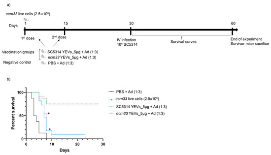 Vaccination schedule (a) and survival curves (b) of a murine model of IC, showing the protective effect achieved with immunization with SC5314 YEVs and ecm33 YEVs. Mice were immunized with different doses of EVs with adjuvant (Ad) and subsequently challenged with an intravenous lethal dose of SC5314 (1 × 106 cells). Vaccination with live cells (2.5 × 106 cells, one dose) of the completely avirulent ecm33Δ mutant was included as a positive vaccination control (a,b). * Mantel–Cox test, p < 0.05.