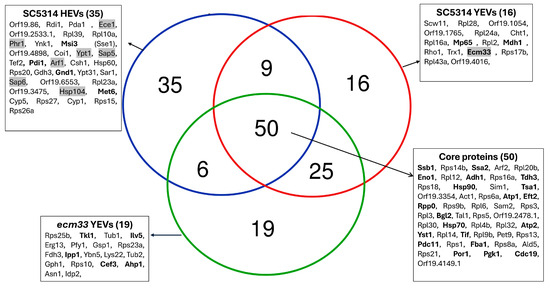 Focusing on the proteins most abundantly present in each vesicle type (top 100), all three vesicle types shared a core set of 50 proteins (Figure 7). Additionally, exclusive proteins were identified among the top 100 of each vesicle type: 35 unique proteins in SC5314 HEVs, 16 in SC5314 YEVs, and 19 in ecm33 YEVs. The shared core includes several proteins previously identified as immunogenic, which may help explain why all three types demonstrated a certain degree of protective capacity. Notably, only the HEVs contained seven proteins implicated in fungal virulence within their set of most abundant proteins (Arf1, Ece1, Hsp104, Phr1, Sap5, Sap6, and Ypt1), with Ece1—the precursor protein of candidalysin—standing out due to its direct association with Candida virulence. Among the proteins identified as most abundant exclusively in SC5314 YEVs, there are notable examples known for their strong immunogenic potential, such as Mp65, Mdh1, and Ecm33. The ecm33 YEVs also include highly abundant proteins with immunogenic potential, such as Tkl1, Ilv5, and Ahp1.