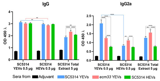 IgG and IgG2a antibody titers. ELISAs with pooled sera obtained prior to infection from immunized mice with SC5314 YEVs (blue), ecm33 YEVs (pink), and SC5314 HEVs (green). Protein samples from SC5314 YEVs, SC5314 HEVs, and total cytoplasmic extracts from the wild-type strain SC5314 were used for detection purposes. Statistically significant differences in antibody titers were observed across all groups compared to the control group. Two-way ANOVA test, ** p < 0.01, **** p < 0.0001.