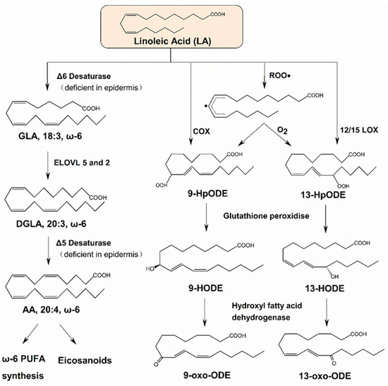 - Zheng, Y.; Yin, H.; Boeglin, W.E.; Elias, P.M.; Crumrine, D.; Beier, D.R.; Brash, A.R. Lipoxygenases Mediate the Effect of Essential Fatty Acid in Skin Barrier Formation. J. Biol. Chem. 2011, 286, 24046–24056. [Google Scholar] [CrossRef] [PubMed]