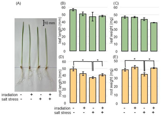 Morphological effects on MMW-irradiated wheat treated with salt stress. Wheat seeds were irradiated with or without MMW and sown. For nontreated groups, wheat seedlings were collected 5 days after sowing (Figure S1). For the salt-stress groups, 3-day-old wheat plants were subjected to salt stress for 2 days and collected (A). As seedling collection, leaf (green column) and root (orange column) were collected. As morphological parameters, leaf length (B), leaf-fresh weight (C), main-root length (D), and total-root fresh weight (E) were measured. The bar in the picture indicates 10 mm. Data are shown as the mean ± SD from 3 independent biological replicates (Figure S2), with 10 plants per each replicate. Asterisks indicate significant changes between the 2 groups using Student’s t-test (* p < 0.05).
