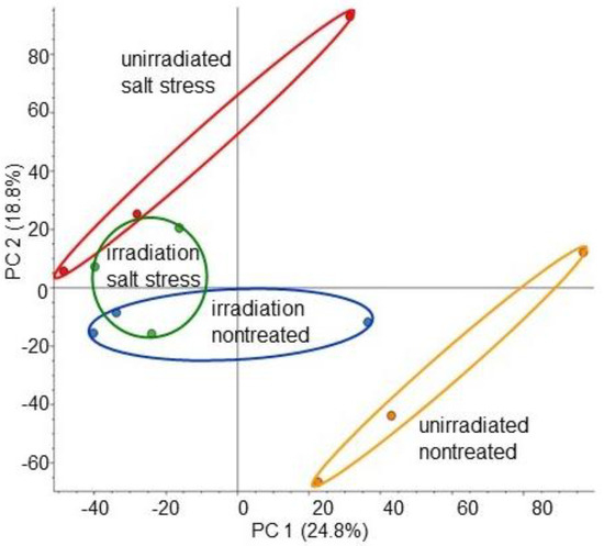 Summary of whole-proteomic data for 12 wheat samples based on principal-component analysis. Wheat seeds irradiated with or without MMW were sown, and the 3-day-old seedlings were treated with or without salt stress for 2 days. Roots from 4 groups were collected, which were unirradiated/nontreated (orange), irradiated/nontreated (blue), unirradiated/salt stress (red), and irradiated/salt stress (green). Proteomics was carried out on three independent biological replicates for each treatment. Principal-component analysis was conducted using Proteome Discoverer.