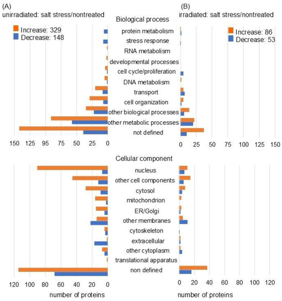 Functional categorization of differentially abundant proteins using proteomic analysis. Wheat seeds were irradiated with (irradiated) or without (unirradiated) MMW, and the seedlings were treated with (salt stress) or without (nontreated) salt stress. After the proteomic analysis of proteins extracted from the roots, functional classification of significantly increased (orange) and decreased (blue) proteins (p < 0.05) from unirradiated (A) or irradiated (B) wheat treated with or without salt stress was performed using gene-ontology analysis (Tables S3 and S4).