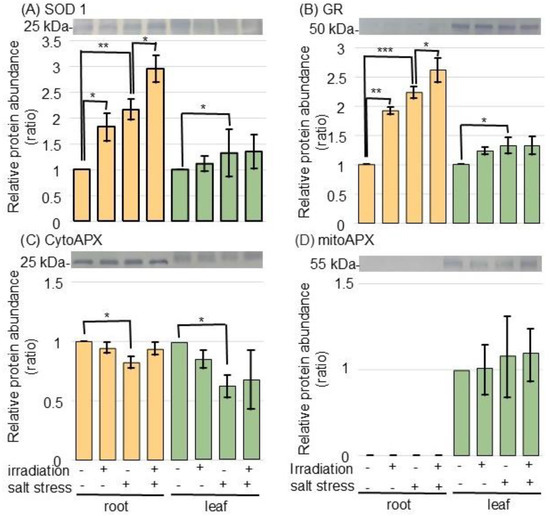 To confirm the changes in ROS-scavenging-related proteins, the accumulation of superoxide dismutase (SOD) 1 (Cu/Zn SOD), glutathione reductase (GR), and ascorbate peroxidase (APX) was analyzed by immunoblot analysis (Figure 4 and Figure S4–S6). SOD 1 and GR accumulated in the root and leaf under salt stress, while they further accumulated in the root of wheat irradiated with MMW (Figure 4A,B). The abundance of cytosolic APX decreased with salt stress; however, there was no change with irradiation. The abundance of mitochondrial APX was not altered by any treatment (Figure 4C,D).