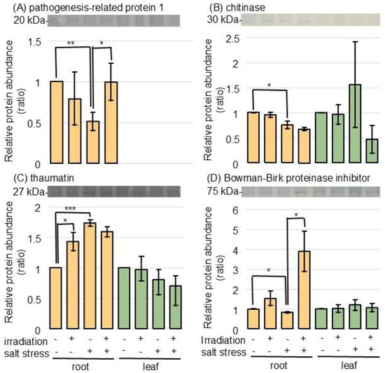 To confirm the changes in pathogen-related proteins, the accumulation of pathogenesis-related protein 1, chitinase, thaumatin, and the Bowman–Birk proteinase inhibitor was analyzed using immunoblot analysis (Figure 5 and Figure S7–S10). The abundances of pathogenesis-related protein 1, chitinase, and Bowman–Birk proteinase inhibitor decreased, while thaumatin increased in the root under salt stress (Figure 5). The suppressed abundance of pathogenesis-related protein 1 and Bowman–Birk proteinase inhibitor was restored in the wheat irradiated with MMW (Figure 5A,D).