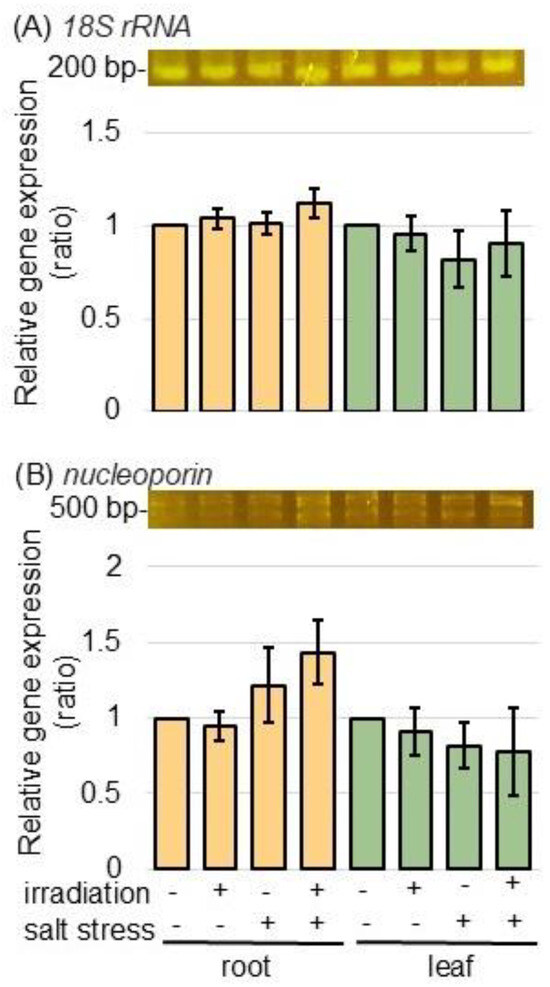 The expression of gene-encoding nucleoporin in wheat irradiated with MMW under salt stress. Wheat seeds were irradiated with or without MMW, and seedlings were treated with or without salt stress. After isolating total RNA from root and leaf samples, 18S rRNA (A)—specific and nucleoporin (B)—specific oligonucleotides were amplified using PCR. 18S rRNA was used as an internal control. After agarose-gel electrophoresis, the integrated densities of bands were calculated using ImageJ software. Data are shown as the mean ± SD from 3 independent biological replicates.