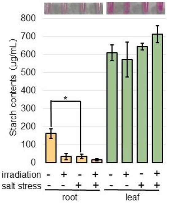 The starch contents in wheat irradiated with MMW under salt stress. Wheat seeds were irradiated with or without MMW, and seedlings were treated with or without salt stress. Starch was extracted from roots and leaves. A portion (10 mg) of samples was ground in 1 mL of phosphate-buffered saline. Free glucose and small oligosaccharides were removed with ethanol. After centrifugation, the soluble starch in the pellet was extracted with 1 mL of water. The contents were analyzed using a Starch Assay Kit. The picture shows the color of the sample after the reaction. Data are shown as the mean ± SD from three independent biological replicates. Statistical analysis is the same as in Figure 1 (*, p < 0.05).