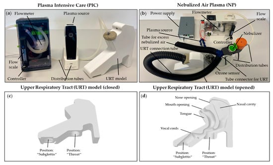 Figure 1c,d) features two openings at the top, representing the mouth and nose. Through the “mouth” opening, the pressurized air plasma is directed towards deeper regions of the respiratory tract. At the bottom of the model, two slots hold cell culture dishes (35 mm Petri dish; Corning Life Sciences, Wiesbaden, Germany) that serve as placement sites for the samples. These represent anatomical positions within the respiratory tract: one above the vocal cords (position: “throat”) and one below the vocal cords (position: “subglottis”). To simulate the moist environment of the respiratory tract, the interior of the URT model was lined with gauze and rinsed with 25 mL of DPBS immediately before treatment.
