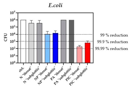 A volume of 100 µL of bacteria suspension (∼106/mL; E. coli ATCC 25922; LGC Standards GmbH, Wesel, Germany) was applied to Ø 9 cm Müller–Hinton agar plates (Oxoid Deutschland GmbH, Wesel, Germany) and was allowed to dry for 30 min. From Müller–Hinton agar plates, 3 × 35 mm (Ø) samples were punched out, transferred to a 35 mm petri dish (Corning Life Sciences, Wiesbaden, Germany), and subjected to different treatments (ctrl., N, NP, PA, PIC) for 5 min at the “throat” and “subglottis” positions in the URT model. After subsequent incubation of the petri dishes at 37 °C for 24 h, colony forming units (CFUs) were evaluated. For computation of log10-reduction rates, CFUs of serial dilutions of the original bacterial suspensions at OD = 0.6 were evaluated. Each experiment was carried out n = 3 in duplicated form, and the results were averaged.
