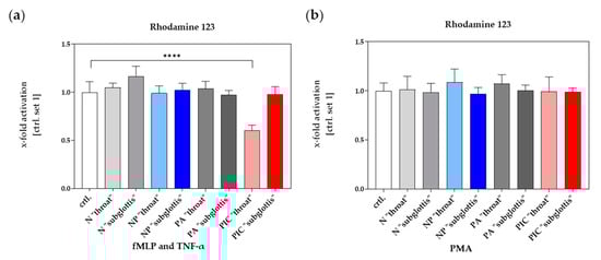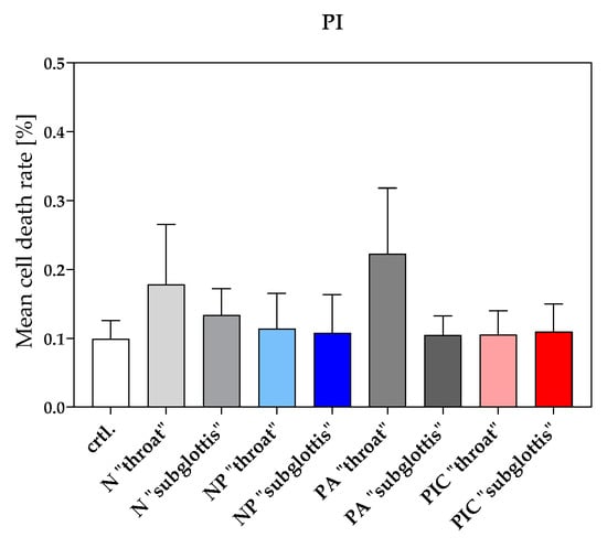 Flow cytometry (FACSCalibur, BD Sciences, Franklin Lakes, NJ, USA) was used in combination with the software CellQuest Pro (version 5.2, BD Biosciences) to evaluate the expression of surface antigens (CD11b, CD62L, and CD66b), respiratory burst activity in form of ROS production and cell death rates of PMNs after different treatments (ctrl., N, NP, PA, PIC) at the positions (“throat” and “subglottis”). As in