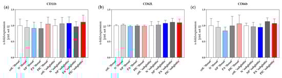 In addition, the expression of different surface markers play a decisive role during the process of PMN activation. The selectin CD62L is eliminated from the plasma membrane through ectodomain shedding, which in turn is an indicator of neutrophil activation associated with the upregulation of integrin CD11b expression. CD66b, a neutrophil immunoreceptor, also indicates activation by upregulation [