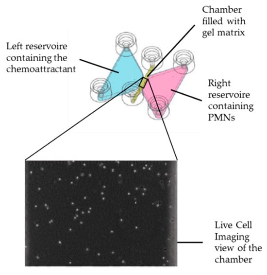 Figure 10). The chambers were filled with a gel matrix composed of bovine type I collagen (PureCol Bovine Collagen Solution Type I, 3 mg/mL, Advanced BioMatrix, Carlsbad, CA, USA) that was accessible to the PMNs and supplemented with specific fluorescent dyes: