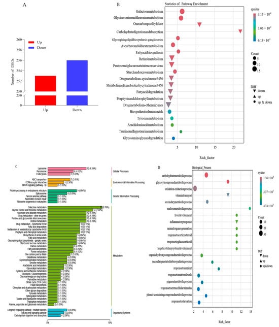 The separation and quantitative measurement of the metabolites were carried out using a tandem Q Exactive high resolution mass spectrometer (Thermo Fisher Scientific, Waltham, MA, USA, product code: 0725500) and a Waters UPLC I-Class Plus (Waters, Milford, MA, USA, product code: I-Class Plus). The chromatographic separation was performed on a Waters ACQUITY UPLC BEH C18 column (1.7 µm, 2.1 × 100 mm, Waters, USA), and the column temperature was maintained at 45 °C. The mobile phase consisted of 0.1% formic acid (A) and acetonitrile (B) in the positive mode, and in the negative mode, the mobile phase consisted of 10 mM ammonium formate (A) and acetonitrile (B). The gradient conditions were as follows: 0–1 min, 2% B; 1–9 min, 2–98% B; 9–12 min, 98% B; 12–12.1 min, 98% B to 2% B; and 12.1–15 min, 2% B. The flow rate was 0.35 mL/min, and the injection volume was 5 µL. Primary and secondary mass spectrometry data acquisition was performed using Q Exactive (Thermo Fisher Scientific, USA). The full scan range was 70–1050 m/z with a resolution of 70,000, and the automatic gain control (AGC) target for MS acquisitions was set to 3 × 106 with a maximum ion injection time of 100 ms. The ESI parameters were set as follows: the sheath gas flow rate was 40, the aux gas flow rate was 10, the positive-ion mode spray voltage was 3.80, the negative-ion mode spray voltage was 3.20, the capillary temperature was 320 °C and the aux gas heater temperature was 350 °C. The raw data files generated by the UHPLC-MS/MS were processed using the Compound Discoverer 3.3 (CD 3.3, Thermo Fisher) to perform peak alignment, peak picking, and quantitation for each metabolite. A principal components analysis (PCA), partial least squares discriminant analysis (PLS-DA) and orthogonal partial least squares discriminant analysis (OPLS-DA) were performed at metaX (https://metax-tech.com/en, accessed on 5 March 2024) [58] (a flexible and comprehensive software for processing metabolomics data). Volcano plots were used to filter metabolites of sugar based on the log2 (FC) and log10 (p-value) of metabolites. For clustering heat maps, the data were plotted by a heatmap package in R language (https://www.r-project.org/, accessed on 5 March 2024). The functions of these metabolites and metabolic pathways were studied using the KEGG database. The metabolic pathways enrichment of differential metabolites was performed, and when the p-value of the metabolic pathway < 0.05, metabolic pathways were considered as statistically significant enrichment.