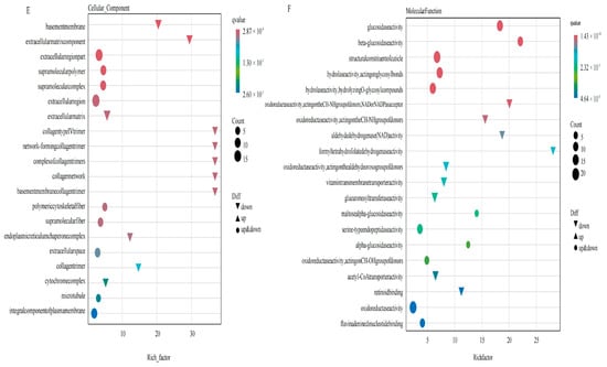 Overview of transcriptome of cotton aphid fed on TG cotton. (A) Up- and down-regulated DEGs. (B) KEGG pathway enrichment analysis of DEGs. Circle sizes indicate total number of enriched genes. X-axis shows enrichment factor. (C) KEGG classification enrichment analysis of DEGs. (D–F) Functional categories of DEGs in molecular functions (MFs), biological processes (BPs) and cellular components (CCs). Circle sizes indicate total number of enriched genes. X-axis shows enrichment factor.