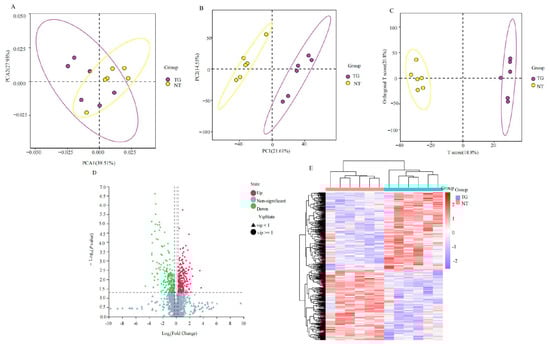Overview of metabolome of cotton aphid fed on TG cotton. (A–C) PCA, PLS-DA and OPLS-DA score plots of metabolomics data obtained by LC-MS/MS analysis of cotton aphid fed on TG cotton and NT cotton. (D) Volcano map of DAMs in cotton aphid fed on TG cotton and NT cotton. Horizontal coordinates were log2-transformed fold change; vertical coordinates were -log10-transformed p-value. Down-regulated significantly different metabolites shown in blue, up-regulated significantly different metabolites shown in red, and non-significant metabolites grayed out. (E) Heatmap of main differential metabolites on cotton aphid treated with NT cotton and TG cotton. Metabolites content highlighted in red (up-regulated) and violet (down-regulated).