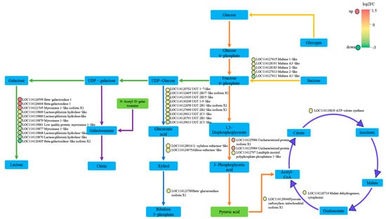 Combined transcriptome and metabolome analyses mapped the KEGG pathway and revealed that the DEGs and DAMs were mainly enriched in multiple glycometabolic pathways, including the galactose metabolism pathway, pentose phosphate pathway, glycolysis and the TCA cycle pathway. These DEGs and DAMs were significantly down-regulated, with 11 DEGs enriched in the galactose metabolism pathway and 12 DEGs enriched in the pentose phosphate pathway. The differential metabolite N-acetylgalactosamine involved in chitin synthesis. The pyruvate and 6 DEGs co-enriched in the glycolysis and TCA cycle pathways, and the pyruvate served as a key link between the two pathways (Figure 3). These results showed that the DEGs and DAMs involved in the glycometabolic pathways were significantly down-regulated in cotton aphid fed on TG cotton, and they were also co-enriched in glycolysis and the TCA cycle by combined transcriptome and metabolome analyses.