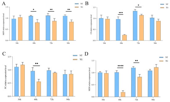 Effects of TG cotton on glycolysis and TCA cycle in cotton aphid. (A–D) Relative expression levels of multiple inositol polyphosphate phosphatase (MIPP), citrate synthase (CS), pyruvate carboxylase (PC) and malate dehydrogenase (MDH) genes in cotton aphid were determined by RT-qPCR at 24 h, 48 h, 72 h and 96 h after being fed on NT and TG cotton. Data are presented as mean ± SD of three independent biological replications. Significant differences between treatment groups and controls were analyzed by Student’s t-test, * p ≤ 0.05; ** p ≤ 0.01; *** p ≤ 0.001; **** p ≤ 0.0001.
