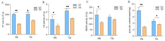 Based on the combined omics techniques analysis, we compared the relative expression levels of DEGs and the pyruvate content in the glycolytic and TCA cycle pathways. Firstly, the relative expression levels of multiple inositol polyphosphate phosphatase (MIPP), pyruvate carboxylase (PC), citrate synthase (CS) and malate dehydrogenase (MDH) in cotton aphid fed on TG cotton after 36 h, 48 h, 72 h and 96 h were detected by a qPCR analysis. The results revealed that the relative expression levels of MIPP, PC, CS and MDH were all significantly down-regulated (Figure 4A–D). In addition, at the metabolite level, we examined the enzymatic activities of PC, CS and MDH after 48 h and 72 h treated with TG cotton, which were also reduced by 1.94-fold, 1.6-fold and 1.73-fold at 48 h, respectively, compared with the control group. The activities of pyruvate carboxylase and citrate synthase were significantly decreased after the cotton aphid fed on the TG cotton for 72 h (Figure 5A–D), and the content of pyruvate, an intermediate product of the glycometabolism, was much lower than that of the control group. Taken together, the relative expression levels of the MIPP, PC, CS and MDH genes were significantly decreased after the cotton aphid fed on TG cotton for 48 h, and both the enzyme activities of PC, CS and MDH and the pyruvate content were also reduced. Together, these results indicated that TG cotton alters both the transcriptomic and metabolomic profiles of cotton aphid, particularly affecting the glycolysis and TCA cycle processes.