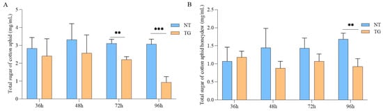Total sugar content and honeydew of cotton aphid treated with TG cotton. (A) Total sugar levels of cotton aphid after feeding on NT and TG cotton for 36 h, 48 h, 72 h and 96 h. (B) Total sugar levels of cotton aphid and their honeydew after feeding on NT and TG cotton for 36 h, 48 h, 72 h and 96 h. Data are presented as mean ± SD of three independent biological replications. Significant differences between treatment groups and controls were analyzed by Student’s t-test, ** p ≤ 0.01; *** p ≤ 0.001.