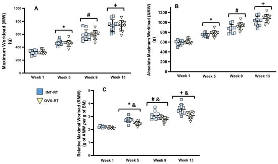 Evaluation of Maximum Workload. Experimental trained groups: INT-RT (intact resistance training) and OVX-RT (ovariectomized resistance training). (A) Maximum workload (grams); (B) absolute maximal workload (grams); (C) relative maximum workload (grams of AMW per gram of BM). Evaluation periods: weeks, 1, 5, 9, and 13. Values are expressed as means ± standard deviations (SD), with n = 10 per group. To compare differences in maximal workloads (MW, AMW and RMW) between groups in the same week, and between weeks (time) in the same group, two-way ANOVA and post hoc Sidak’s multiple comparisons test were used, p < 0.05. * indicates a significant difference between week 5 and week 1; # indicates a significant difference between week 9 and week 5; + indicates a significant difference between week 13 and week 9; & indicates a significant difference between groups in the same week.