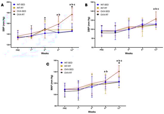 Temporal hemodynamics evaluation over 13 weeks of the experimental protocol. Values are expressed as the mean ± standard deviation (SD), n = 10 per group. (A) SBP: systolic blood pressure; (B) DBP: diastolic blood pressure; (C) MAP: mean arterial pressure. Intact group (INT): intact sedentary (INT-SED) and intact resistance training (INT-RT). Ovariectomy group (OVX): ovariectomy sedentary (OVX-SED) and ovariectomy resistance training (OVX-RT). To compare differences in hemodynamics parameters (SBP, DBP, and MAP) between groups in the same week, and between weeks (time) in the same group, two-way ANOVA and post hoc Sidak’s multiple comparisons test were used, p < 0.05. * denotes a significant difference compared with the other groups; a denotes a significant difference compared with the initial evaluation (PRE); b denotes a significant difference compared with week 5; c denotes a significant difference compared with week 9.