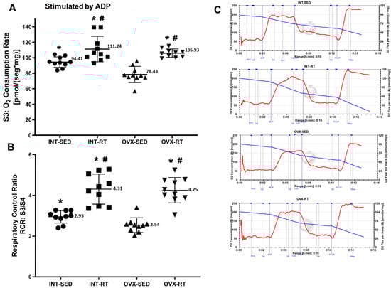 17β-estradiol (E2) acts centrally and systemically to regulate energy balance and metabolism [55]. Menopause occurs due to ovarian reserve depletion that results in a progressive decline in E2 levels [56]. This decrease in E2 levels promotes mitochondrial bioenergetic dysfunction through a decrease in complex I activity, as observed in the mRNA levels of complex I (CI), electron transfer, and OXPHOS responsiveness [42]. A reduction in OXPHOS capacity promoted by a decrease in E2 levels was observed in the OVX-SED group herein, which presented a reduction of 16.92% compared with the control sedentary group (INT-SED). This reduction was prevented and improved by RT, as the OVX-RT group presented superior OXPHOS capacity compared with the OVX-SED (35.06%) and INT-SED groups (12.20%). Compared with the INT-SED and OVX-SED groups, the INT-RT group presented the highest OXPHOS capacity, which was 16.92% and 41.83% greater than the capacities of the INT-SED and OVX-SED groups, respectively. Consistent with the reduction in OXPHOS capacity promoted by the absence of E2, the respiratory acceptor control ratio (RCR = S3/S2) was lower in the OVX-SED group than in all of the other groups: INT-SED, INT-RT, and OVX-RT. The RCR is the main indicator of mitochondrial respiratory function, reflecting the ability of mitochondria to switch between low and high respiratory rates in response to ADP, and has been suggested to be a good indicator for assessing mitochondrial respiratory dysfunction, even when the electron transport chain capacity remains intact [57,58]. Low RCR ratios can also be interpreted as a limited mitochondrial OXPHOS capacity [59].