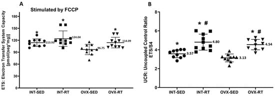 Mitochondrial noncoupled respiration in kidney cortex biopsy. Panel (A) electron transfer system capacity (ETS), a noncoupled state measured under FCCP stimulation. Panel (B) presents the uncoupled control ratio (UCR), calculated as ETS divided by respiratory state 4. Results are expressed as means ± standard deviations (SD), with n = 10 per group. The study includes the groups: ovariectomy (OVX), subdivided into sedentary ovariectomy (OVX-SED) and resistance training ovariectomy (OVX-RT), and intact (INT), subdivided into sedentary intact (INT-SED) and resistance training intact (INT-RT). Statistical significance was determined using one-way ANOVA and Fisher’s post hoc test, with a threshold of p < 0.05. * denotes a significant difference for the OVX-SED group, while # denotes a significant increase compared with the INT-SED group.