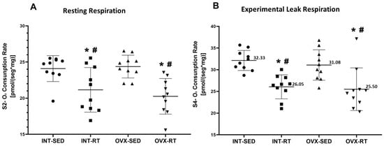 In state 4 (S4), the oligomycin-inhibited state or experimental leak respiration, the OVX-SED group presented a significant increase in oxygen consumption (31.08 pmol/[s·mg]) compared with both the INT-RT (26.05 pmol/[s·mg], p = 0.0029) and OVX-RT groups (25.50 mol/[s·mg], p = 0.0011) (Figure 5B). Similarly, the INT-SED group had elevated oxygen consumption (32.33 pmol/[s·mg]) compared with the INT-RT (26.05 pmol/[s·mg], p = 0.0004) and OVX-RT groups (25.50 mol/[s·mg], p = 0.0001) (Figure 5B). No significant differences in S4 oxygen consumption were found between the sedentary INT and OVX groups.