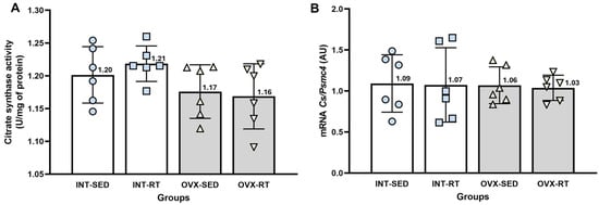 Analyses of citrate synthase. (A) Citrate synthase activity in kidney cortex biopsies. (B) Real-time PCR analysis of citrate synthase gene expression, normalized to Psmc4. Values are presented as means ± standard deviations (SD). The intact group (INT) includes the intact sedentary (INT-SED) and intact resistance training (INT-RT) subgroups. The ovariectomy group (OVX) comprises the ovariectomy sedentary (OVX-SED) and ovariectomy resistance training (OVX-RT) subgroups. No significant differences were observed between groups, as determined by one-way ANOVA and Fisher’s post hoc test, p < 0.05.
