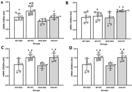 RT–qPCR analysis of gene expression related to the electron transport chain complexes I to IV in the kidney cortex. B2m (beta-2 microglobulin) was used as an endogenous reference gene. (A) CI: NADH dehydrogenase; (B) CII: succinate dehydrogenase; (C) CIII: ubiquinone cytochrome c oxidoreductase; and (D) CIV: cytochrome c oxidase. Expression levels are reported in arbitrary units (AU). Groups include INT-SED (intact sedentary), INT-RT (intact resistance training), OVX-SED (ovariectomy sedentary), and OVX-RT (ovariectomized resistance training). Values are expressed as the mean ± standard deviation (SD). Symbols above the SD bars indicate statistical differences between groups, determined by one-way ANOVA followed by Fisher’s post hoc test, p < 0.05. * denotes a significant difference compared with the OVX-SED group; # denotes a significant increase compared with the INT-SED group; and $ denotes a significant difference compared with the OVX-RT group.