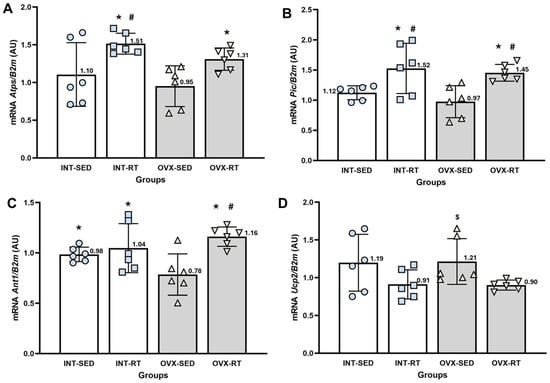 RT–qPCR analysis of gene expression related to the OXPHOS system in the kidney cortex. B2m (beta-2 microglobulin) was used as an endogenous reference gene. (A) Atps: ATP synthase; (B) Pic: phosphate carrier; (C) Ant1: adenine nucleotide translocase; and (D) Ucp2: uncoupling protein 2. Expression levels are reported in arbitrary units (AU). Groups include INT-SED (intact sedentary), INT-RT, (intact resistance training), OVX-SED (sedentary ovariectomy), and OVX-RT (ovariectomized resistance training). Values are expressed as the mean ± standard deviation (SD). Symbols above the SD bars indicate statistical differences between groups, determined by one-way ANOVA followed by Fisher’s post hoc test, p < 0.05. * denotes a significant difference compared with the OVX-SED group; # indicates a significant difference compared with the INT-SED group; $ denotes a significant increase compared with the OVX-RT group.