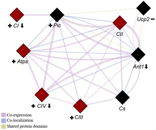Network depicting the interactions among all evaluated genes. The network was generated using the GeneMANIA plugin of Cytoscape software (version 3.10.3) to identify all of the correlations among the genes presented in this study. Genes involved in respiratory chain complexes are highlighted in red, while those related to OXPHOS are represented by diamond shapes. CI (complex I), CII (complex II), CIII (complex III), CIV (complex IV), Atps (ATP synthase), Ant1 (adenine nucleotide translocase-1), Pic (phosphate carrier), Ucp2 (uncoupling protein) and Cs (citrate synthase). Downward arrows indicate genes negatively affected by ovariectomy (OVX), plus signs denote genes with increased expression due to resistance training (RT), and minus signs represent genes with reduced expression in response to RT.